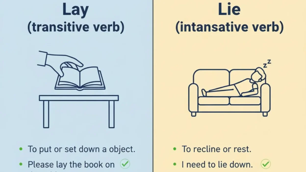 👉 Think: “Lay it down” (object) vs. “Lie down” (yourself). 💤